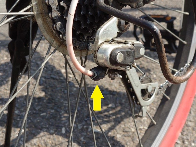 シフター通りにシフトダウンしないときはアジャストボルトを反時計回りに回してインナーケーブルが短くなるように調整し,逆にシフトアップしないときには時計回りに回してインナーケーブルを長くする方向に調整します。