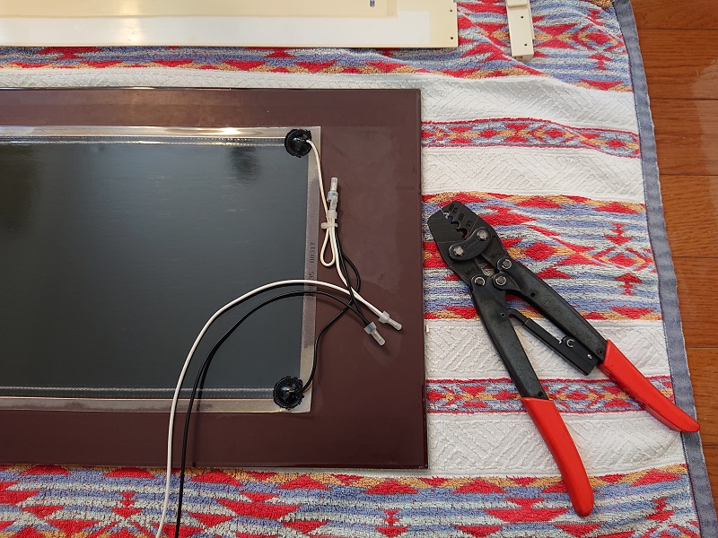 洗面化粧台側との結線はワンタッチコネクターを使用。これならば結線は簡単ですし,また断線した時にどのケーブルがくもり止めなのか簡単に判別して分解することができます。
