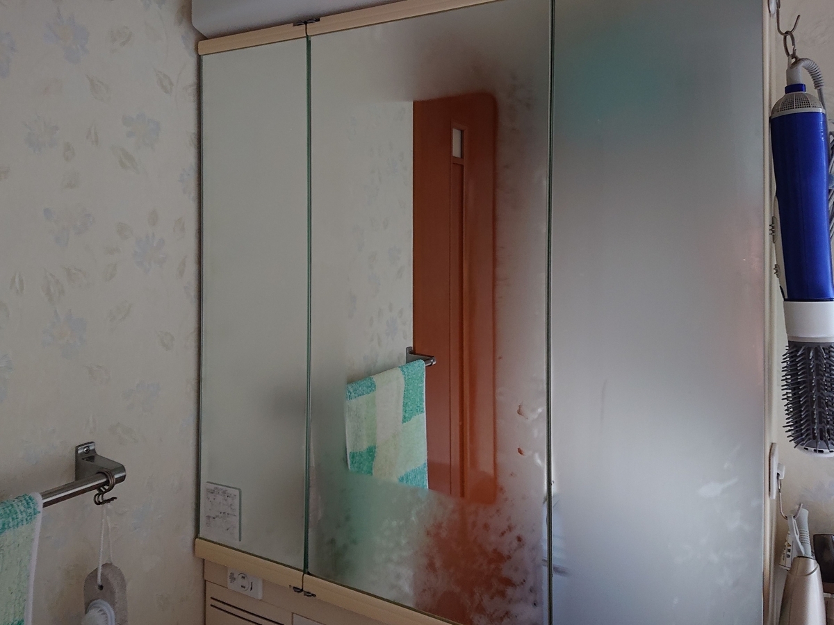 鏡が扉になっていて,開くと収納があるという構造。この鏡が扉になっていてというところが故障の元凶。