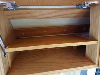 同時に棚板が奥側へガタつかないように棚板にはストッパー,脚には天袋収納の枠に突っ張るスペーサーを追加しました。