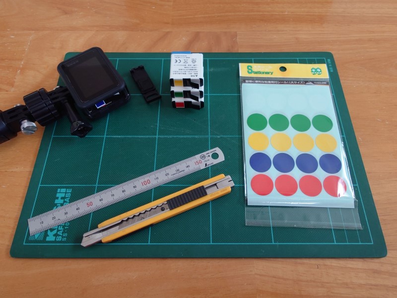 さて,同じバッテリーが4個もあると,どれが空でどれが満充電なのかわからなくなってしまうので,100均で買っておいた粘着貼付シールを利用して識別できるようにしました。
