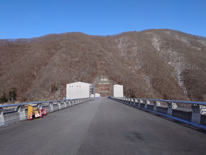 湯西川ダムは重力式コンクリートダム。竣工が2012年と新しいのでまだコンクリートが白いですね。