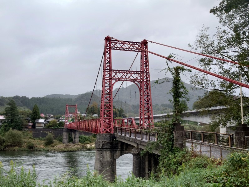 阿賀野川にかかる鹿瀬大橋を走行中に左手を見ると,赤い鉄骨で組まれた吊り橋が!これは見逃せない!