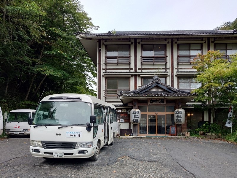 楽なのか辛いのか微妙な調子で7kmの道のりを30分。11:50に夫婦渕駐車場に帰還です。送迎バスの停車場には折り返しで加仁湯へ向かう宿泊客がお待ちかね。