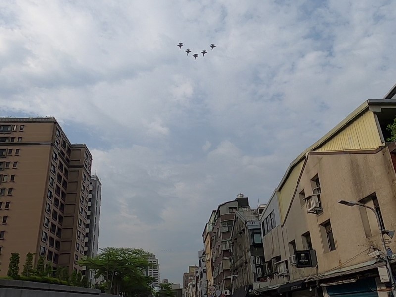 遊歩道をぶらぶらしていると臺北車站の方へ向かって戦闘機の編隊が。