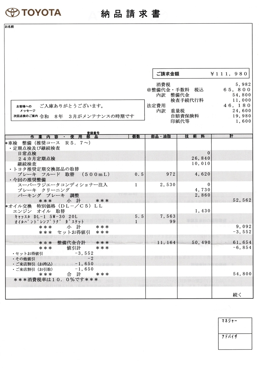 車検に出すのはいつもオイル交換をお願いしているトヨタディーラー。